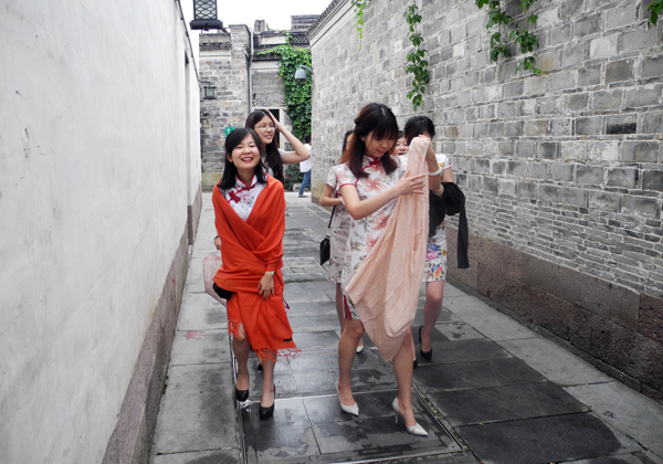 不过,细雨又怎能阻挡大家拍照的兴致呢。这么美的旗袍,不留下些回忆真是太可惜了。于是,烟雨蒙蒙中大家仍然掏出了手机、相机,互相为对方留下美丽的倩影。