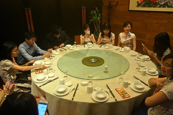 你能想象一群民国打扮的人进餐厅吃饭,服务员是什么表情吗,此处省略100个字……一坐下大家都只顾着把自己的靓照发朋友圈,只有梅经理抬头看了镜头,摄影君表示很忧伤。
