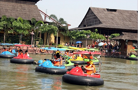 在水上乐园里开碰碰船,既能挡太阳又可以感受到水上飘荡的悠然,偶尔还能感受碰撞带来的乐趣,一举三得。