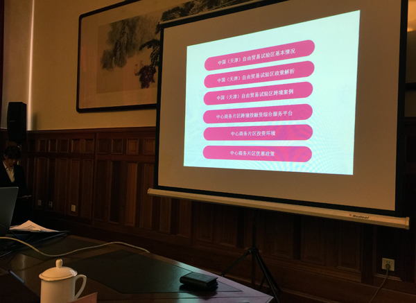 接下来由中心商务区的张南部长围绕天津自贸区政策为大家做了详细的解读,对于天津自贸区政策大家也都非常感兴趣,听得很仔细。