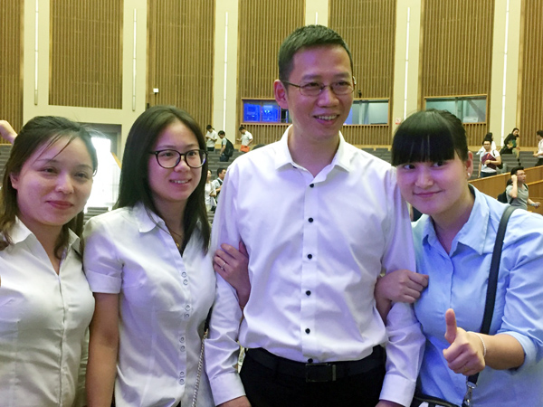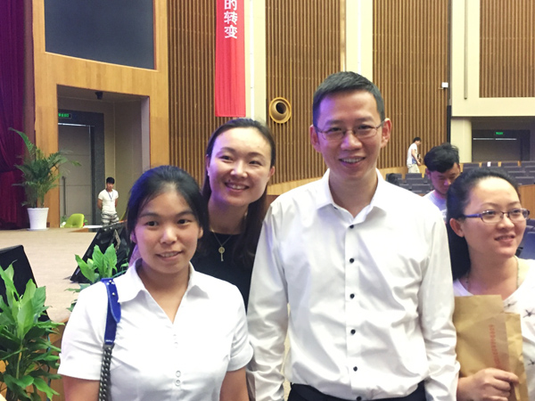 杭州瑞豐商务经理李爱萍、鲍宁艳、刘怡然(从左至右)和吴晓波合影