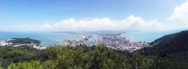 双月湾由大亚湾和红海湾畔相邻的两个半月形海湾组成。两条沙垅直奔大星山,如蛟龙出海,似双龙戏珠,有静有动,十分壮丽。这里三面环海,风景如画。洁白的沙滩,黛绿的林带,碧蓝的大海,多姿的礁石,迷人的小岛,穿梭的渔舟,构成了动静交融的南海渔港风光。