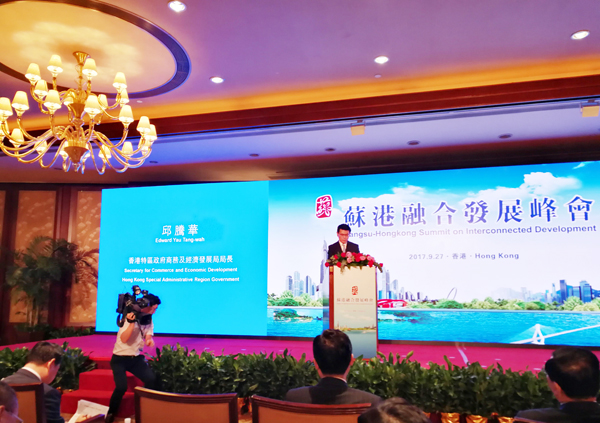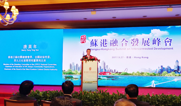 峰会上,香港特区政府商务及经济发展局局长邱腾华先生,全国政协常委、香港江苏社团总会会长唐英年先生等分别致辞,表示要进一步发挥推动促进作用,积极推进苏港交流合作,为苏港融合发展作出更大贡献。
