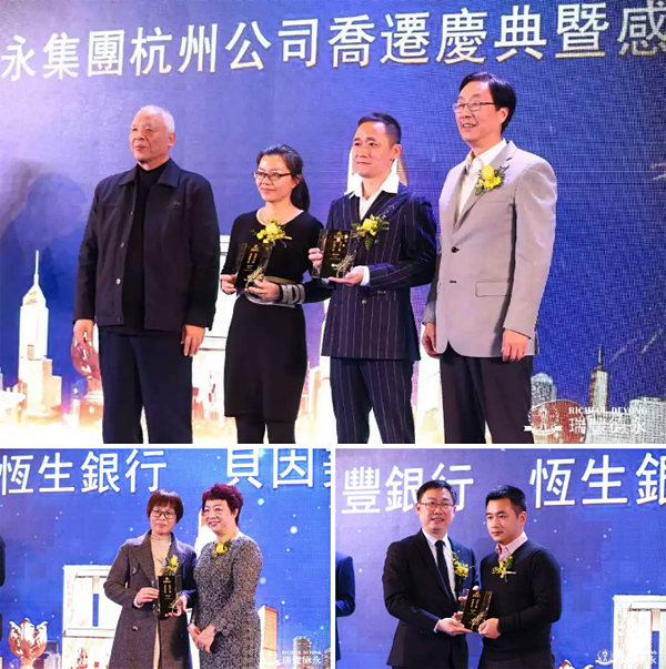 为了对多年来给予瑞豐德永集团大力支持和紧密合作的伙伴和客户表达感恩之情,晚会现场还为以汇丰银行、恒生银行、贝因美集团、富莱森控股集团为代表的突出企业致送了感恩纪念牌。
