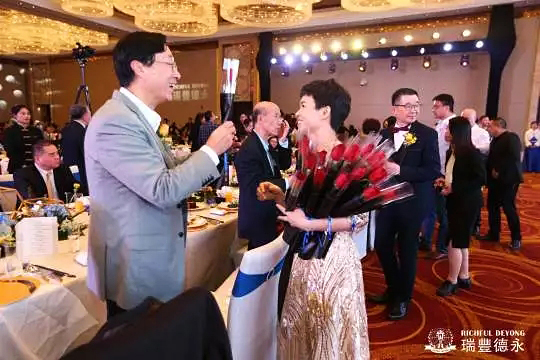 随后的感恩答谢晚宴在杭州洲际酒店举行,政协杭州市副主席、浙江省工商联副主席、杭州市工商联主席冯仁强主席,香港特区政府驻浙江联络处廖凤娴主任,政协浙江省第九届委员会徐鸿道副主席,中国香港(地区)商会会长萧惠君女士,香港贸发局华中华东代表钟永喜先生等浙港两地领导、金融机构、商会组织、律师事务所、优秀知名企业家等300余位特邀嘉宾盛装出席。觥筹交错间,中国香港(地区)商会会长萧惠君女士、香港贸发局华中华东代表钟永喜先生分别上台致辞,与现场嘉宾们一起为瑞豐德永送去了真挚的祝福,并表达了对集团未来的希冀与美好祝愿。