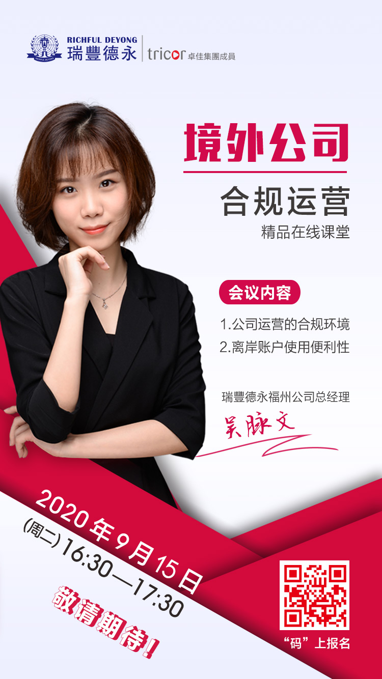 为了更好地引导企业规范海外经营合规管理工作,提高企业国际竞争力,推动企业持续提升合规管理水平,9月15日,瑞豐德永特别安排「境外公司合规运营」线上研讨会,在此我们特别邀请您参与一同探讨。