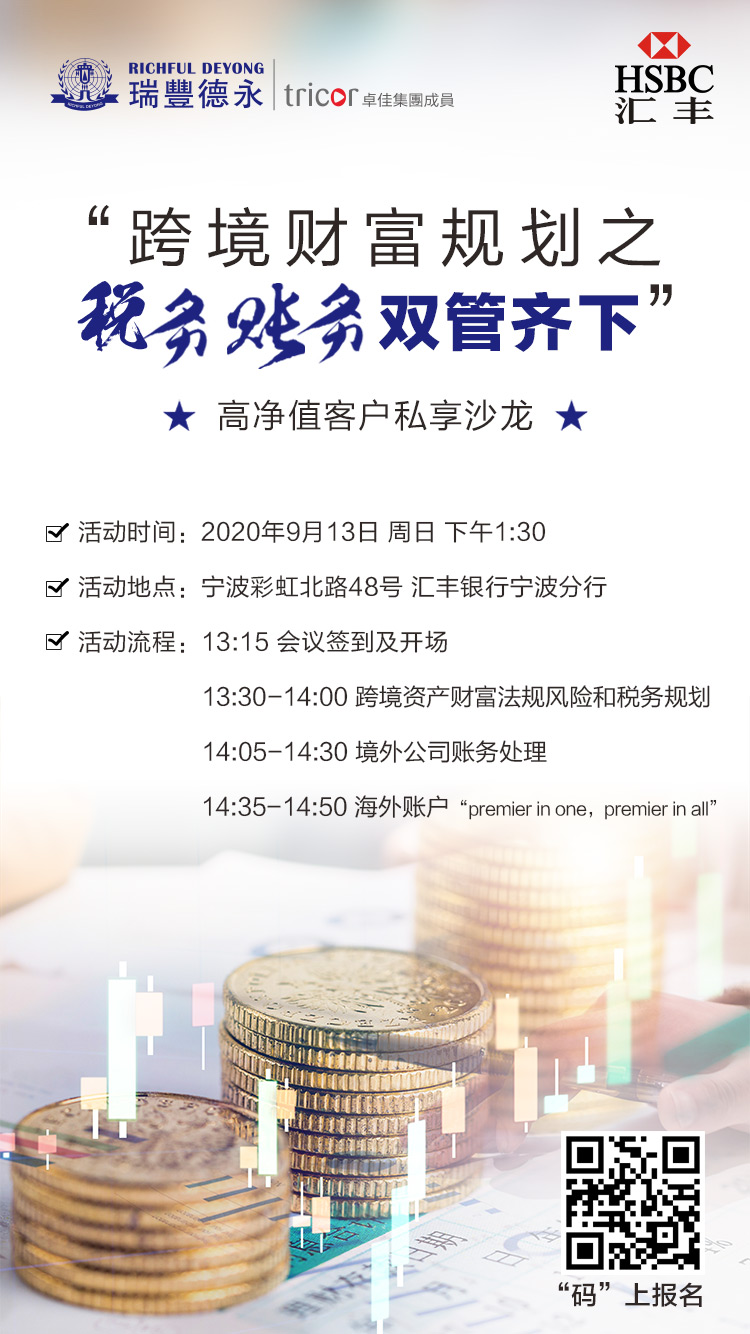 9月13日,瑞豐德永为高净值客户特设「跨境财富规划至税务账务双管齐下」主题私享沙龙,对高净值人士常涉及的跨境财富法规风险和税务规划、境外公司账务处理与海外账户的相关税务账务项目进行讲解,诚邀您参与并出席共同探讨。