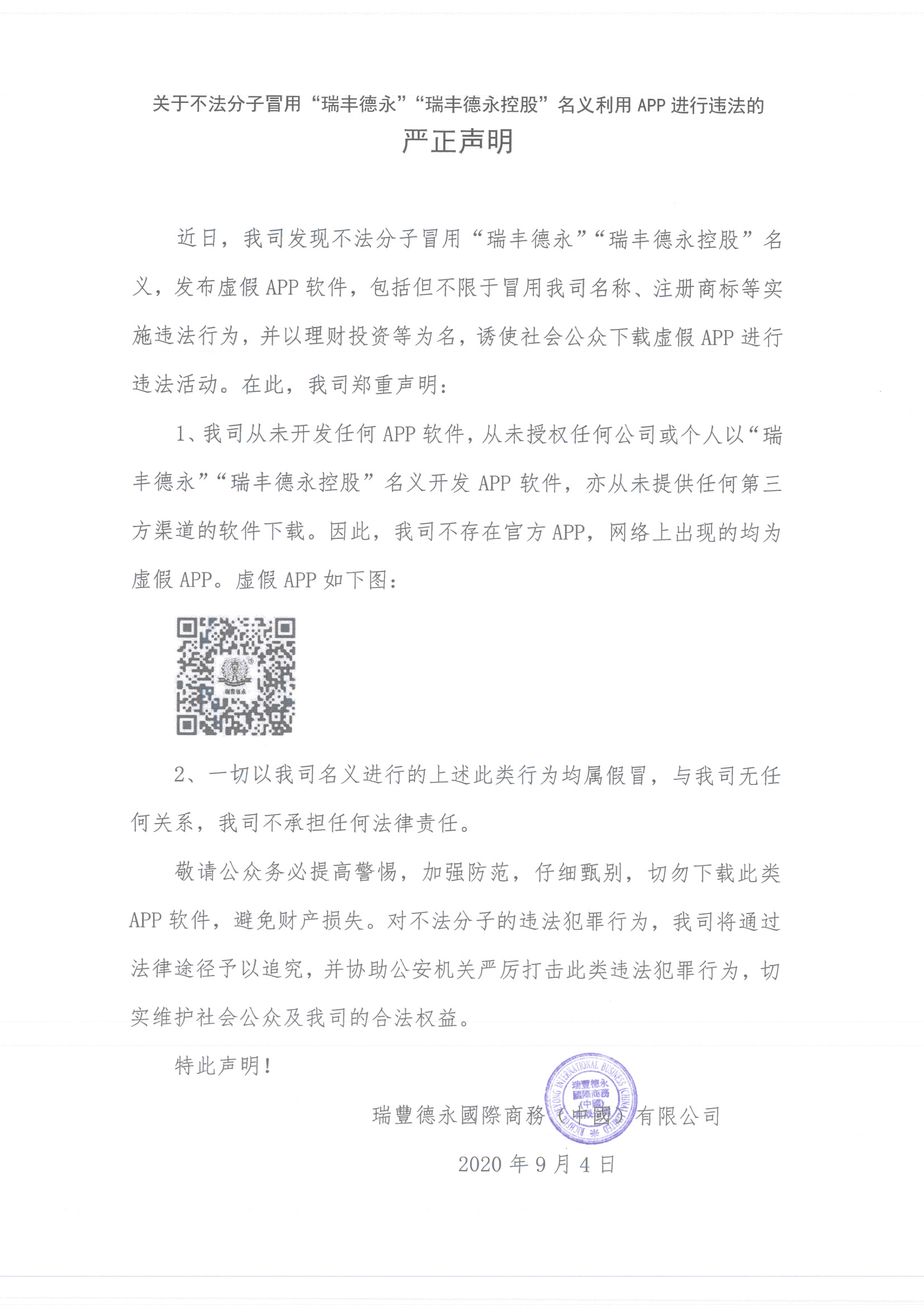 近日,我司发现不法分子冒用“瑞丰德永”“瑞丰德永控股”名义,发布虚假APP软件,包括但不限于冒用我司名称、注册商标等实施违法行为,并以理财投资等为名,诱使社会公众下载虚假APP进行违法活动。在此,我司郑重声明: