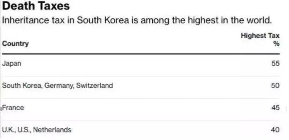 根据安永会计师事务所出具的报告,韩国的遗产税排在世界前列,最高缴纳税率要高于法国的45%,英国、美国的40%,与德国、瑞士持平。