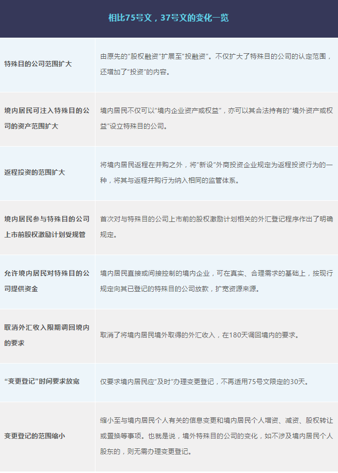 37号文在监管范围、特殊目的公司范围、境内居民境外投资、融资以及返程投资、股权激励计划登记、各项登记程序、处罚依据与措施等方面均进行了较大调整。