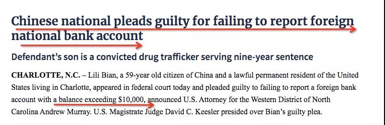 2019年7月8日,住在北卡夏洛特市的59岁中国公民Lili,出现在联邦法庭认罪。她持有美国绿卡,承认在中国境内某金融机构,有超过1万美元的账户,且未向财政部上报外国银行和金融帐户表格(Foreign Bank and Financial Account Form,FBAR),继而遭到联邦起诉。
