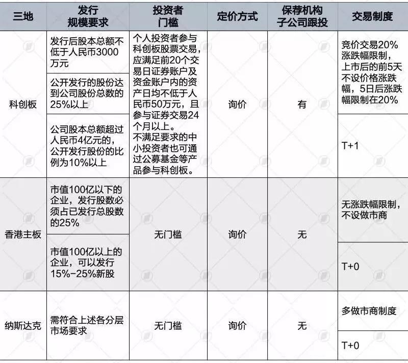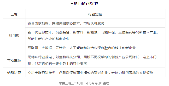 科创板一出,对于想要冲击资本市场的企业来说,又多了一个重要的选择。在科创板的概念刚出现时,就被市场称为中国版“纳斯达克”,同时,在定价、交易等一些环节上与港股市场接近。那问题来了,多了一个选择后,科创板、香港主板、纳斯达克,你的企业该选哪一个市场首发?要选择在哪个市场上市,首要条件当然是要满足该市场的上市条件,这就牵涉到了三地不同的上市规则。以下,从三个市场的上市行业定位、上市条件指标、发行制度、交易制度、退市制度等方面逐一对比,以期给准备上市的企业一个清晰的图景。