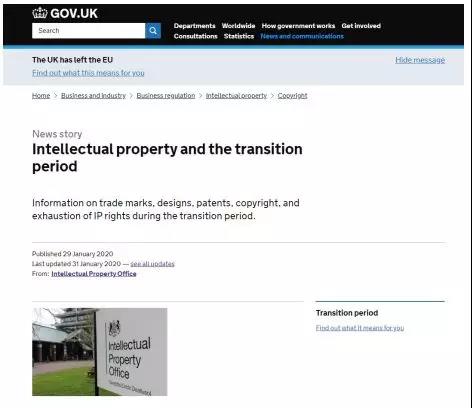 英国知识产权局于 2020 年 1 月 29 日发布并于 31 日更新了知识产权与过渡期通知。
