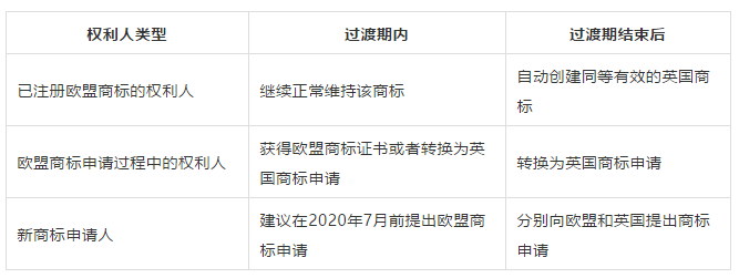 在过渡期内,英国仍是欧盟商标体系中的一员。在此期间,欧盟商标仍在英国有效。根据脱欧协议,在过渡期内,UKIPO不会将欧盟商标转换为英国商标。在过渡期结束时仍在申请欧盟商标的企业、组织和个人可在过渡期结束后的9个月内在英国申请同样的?;?。