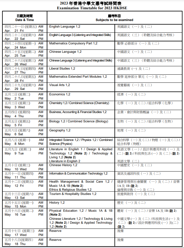 (1)DSE考试科目由4个核心科目加2-3个选修科目组成,大学录取以最佳5门或最佳6门计算成绩。