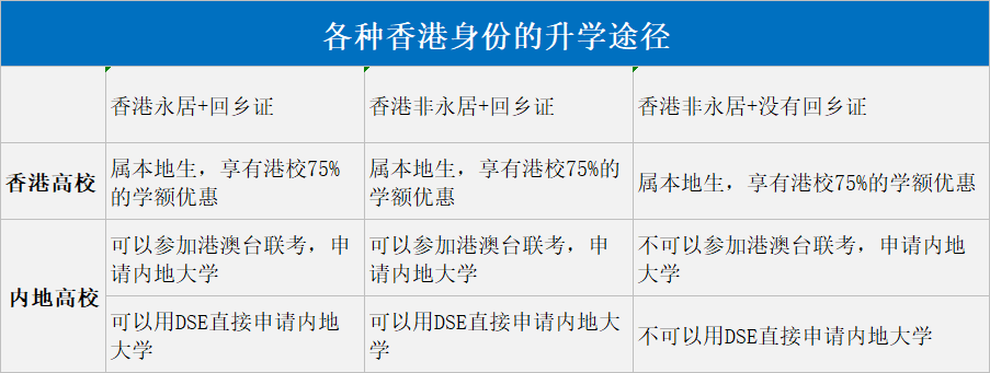 不管是永居还是非永居,关键点在于”回乡证"。有回乡证,就可以DSE和华侨生联考的形式入读内地大学。无论是永居还非永居,只要有回乡证就可以。无论有没有回乡证,只要有香港身份都属于本地生,可以享受75%的学额优惠。不过,无论是那种情况,要想DSE考试优势最大化,都需要持有香港身份。