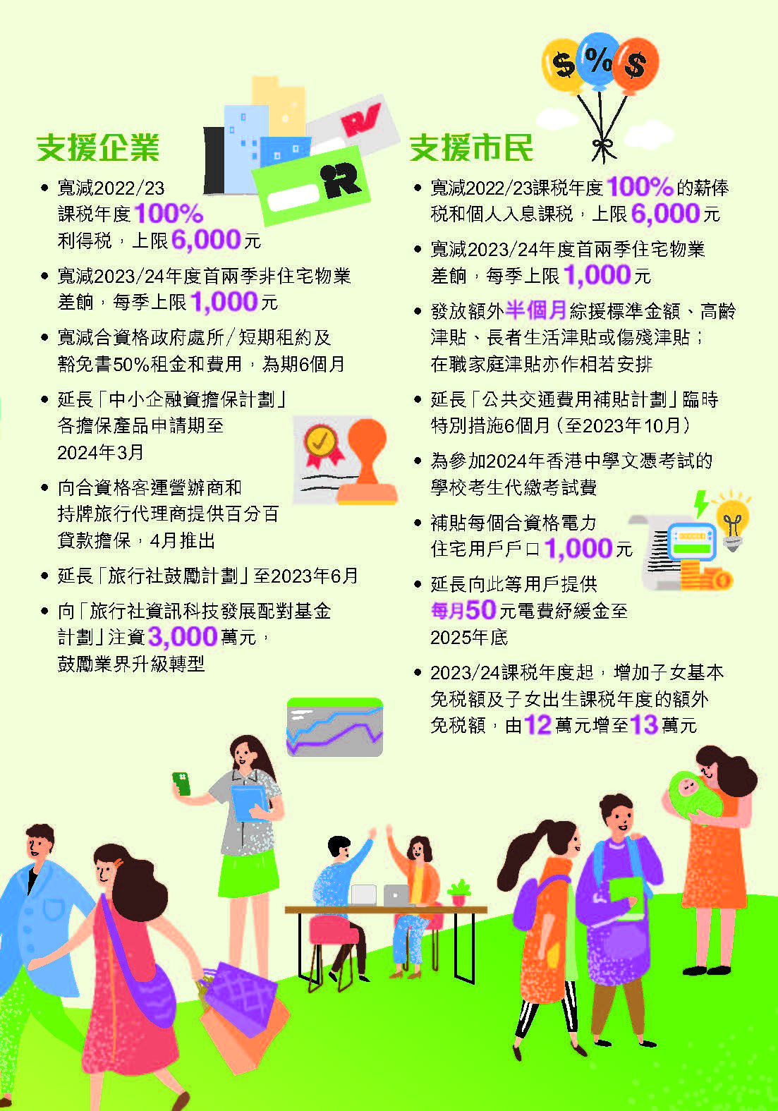 宽减2022/23课税年度100% 的薪俸税和个人入息课税,上限6,000元;