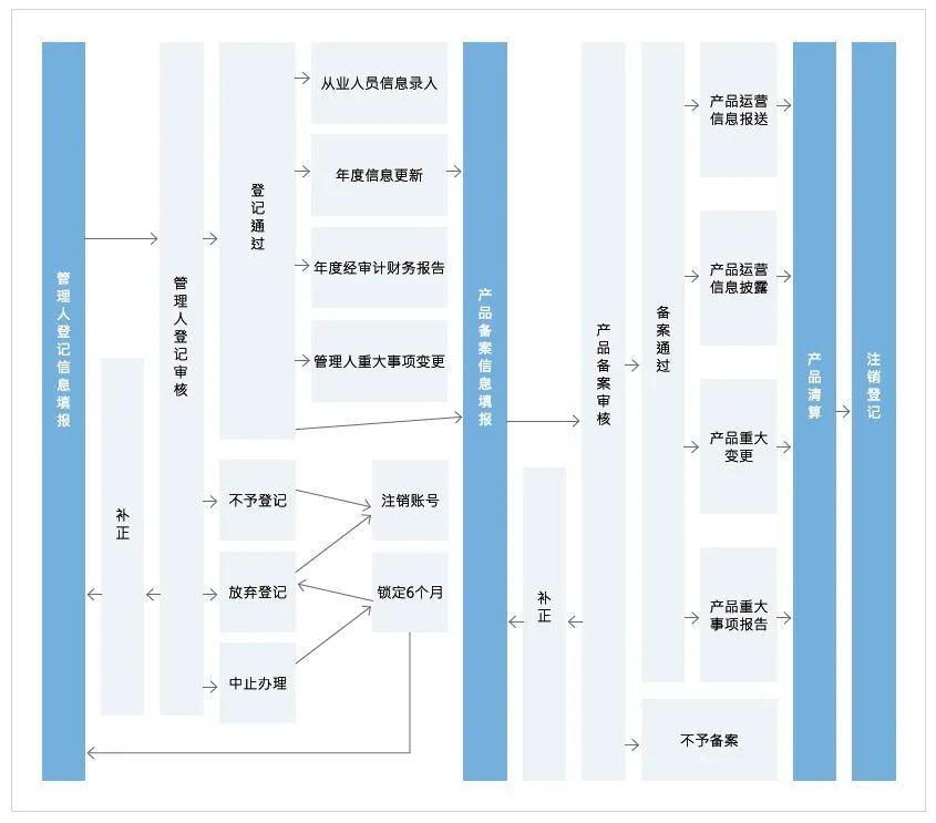 中基协应当在私募基金备案材料齐备后的20个工作日内,通过网站公告私募基金名单及其基本情况的方式,为私募基金办结备案手续。私募基金管理人需通过中基协的资产管理业务综合报送平台进行基金备案,私募基金管理人及私募基金产品登记备案流程如下: