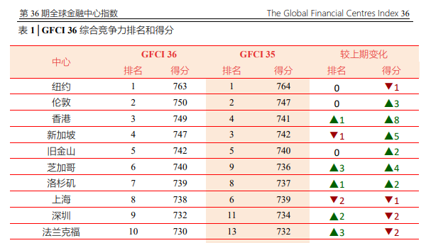 9月24日,备受全球金融界瞩目的第36期《全球金融中心指数》报告(GFCI 36)出炉了。香港的总排名为全球第三位,在亚太区居首,重登亚洲第一金融中心的宝座。在前五名中,香港整体评分也是上升最多的,增加了8分。