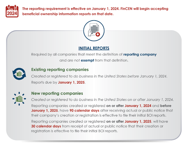 FinCEN的这一要求于2024年1月1日生效,除非属于豁免情形或不适用情形,今年在美国新设或登记经营的企业需要在90日内向FinCEN提交BOI报告,今年之前已经在美存续或登记经营的企业需要在2025年1月1日前向FinCEN提交BOI报告。