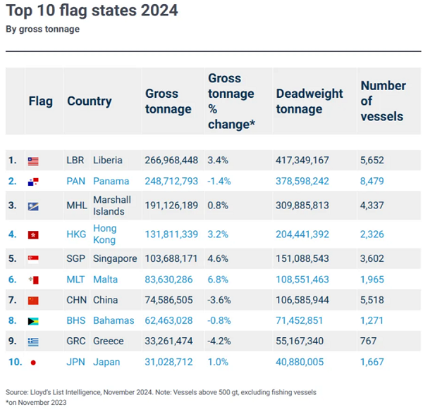 据劳氏船级社数据显示,2024年十大船旗国排名中,前五名分别为利比里亚、巴拿马、马绍尔、香港和新加坡,马耳他,其中利比里亚、巴拿马、马绍尔都是国际运输业工人联合会(ITF)认定的方便旗国家,而新加坡和香港也接受外国公司注册船籍。