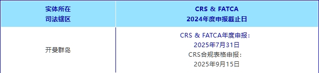 开曼群岛2024年度的共同申报准则(CRS)和外国账户税收合规法案(FATCA)申报截止日即将到来。该申报截止日适用于所有在2024年度成为CRS/FATCA定义下具有申报义务的开曼群岛金融机构。例如,如果您已于2024年设立或者运营开曼基金/基金管理人/基金SPV/投资实体等,此事项与您密切相关。