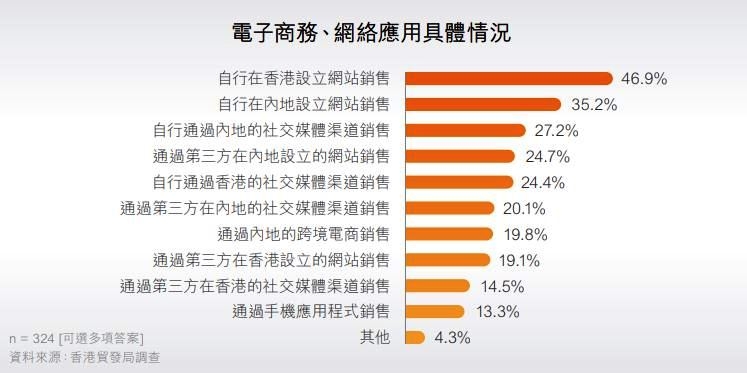 对于在未来会开始或维持/更多利用电子商务、网络应用的企业,46.9%受访企业表示会自行在香港设立网站销售,35.2%表示会自行在内地设立网站销售,其他包括自行通过内地的社交媒体渠道销售(27.2%)、通过第三方在内地设立的网站销售(24.7%)、自行通过香港的社交媒体渠道销售(24.4%)等。