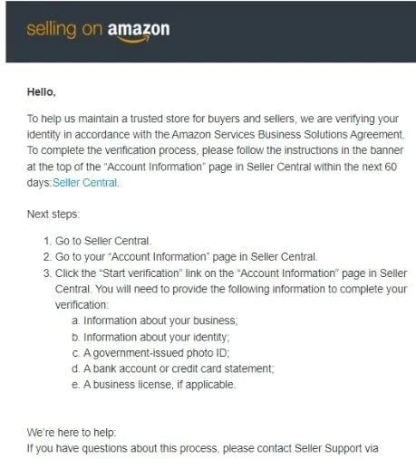 亚马逊将会以邮件形式通知您所需完成的验证操作,并在您卖家账户信息页面上以横幅的形式通知您完成上述一个或多个验证操作。