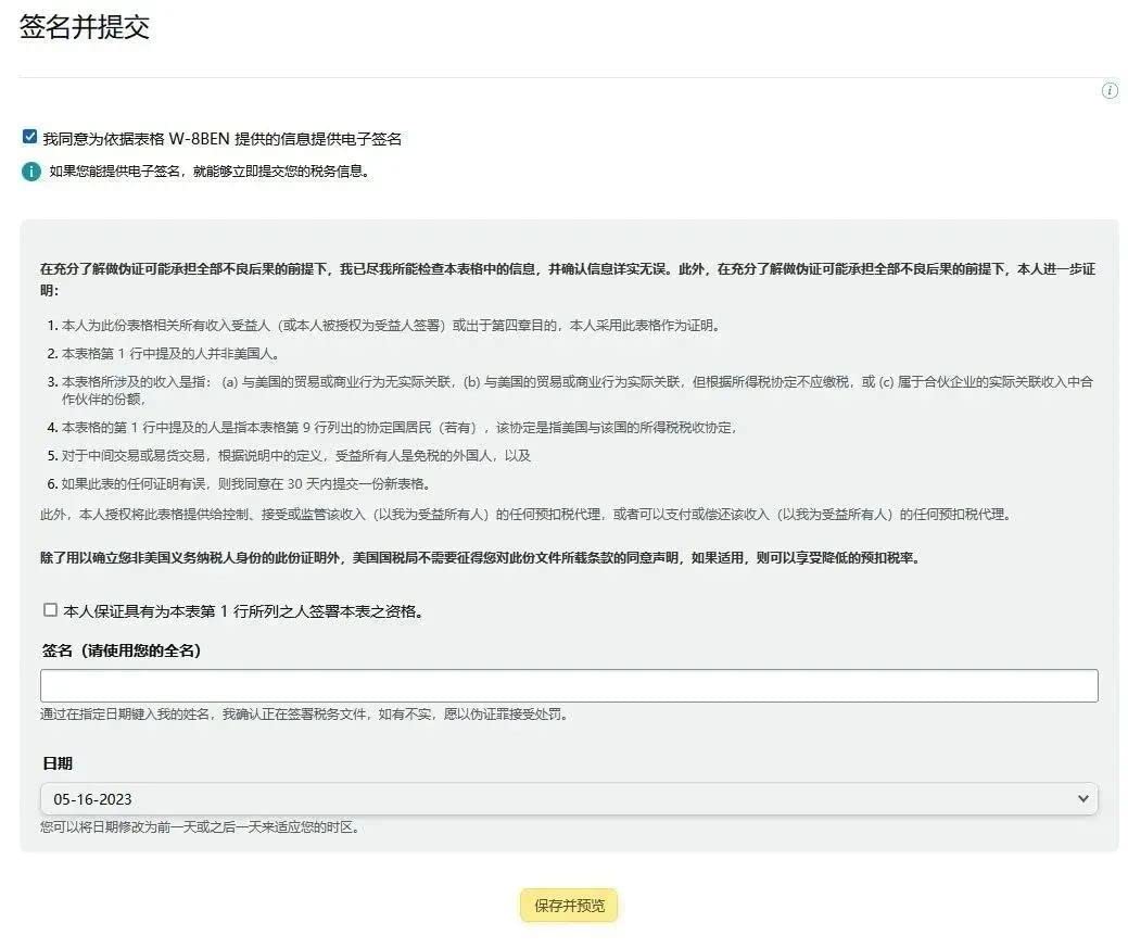 4、点击“继续”,提供电子签名并提交以供亚马逊完成验证。