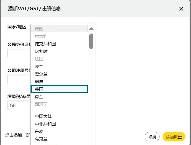2、增值税登记号的法定名称和地址需与您在卖家平台中提供的信息及适用的税务机构数据库的信息保持一致。