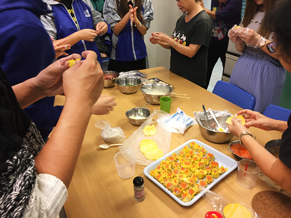 瑞豐义工团都马上动手,听从导师指示分工,先包烧卖和腊肠卷。