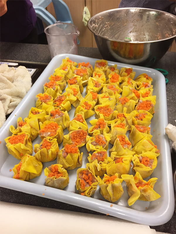 率先完成的就是点心中最有代表的烧卖,配上较为健康的馅料和红萝卜粒作点缀,非常适合长者们品尝。
