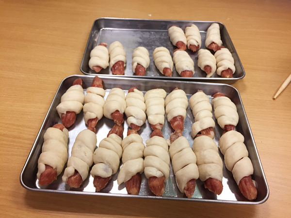 然后就是腊肠卷,人手搓成的面团包上腊肠,只要放入蒸笼就大功告成。