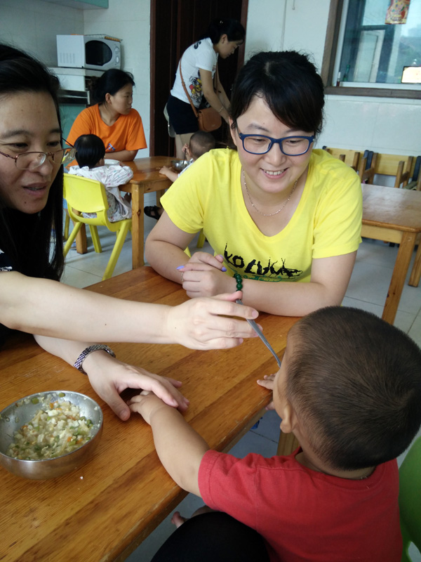 很快到了吃饭的时间,工作人员说这里吃饭是分批的,优先给不能独立吃饭的孩子们喂饭,其次才是能独立吃饭的孩子。工作人员人手不够我们自然也加入到了喂饭的队伍,看着孩子们吃的开心我们的心里也是满满的幸福。