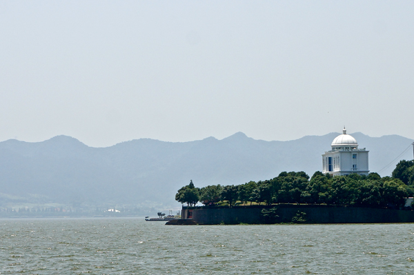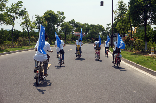 上午9:40活动正式开始,我们从东钱湖游客中心出发,每辆车后面都打出了统一旗帜,展示环保口号,吸引了不少路人的驻足观看。